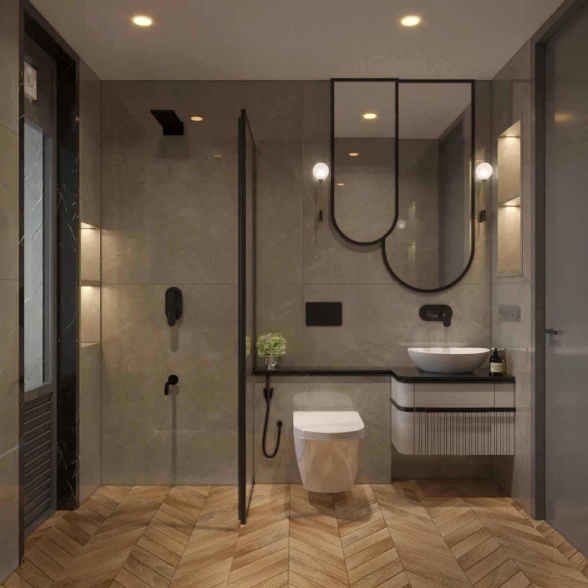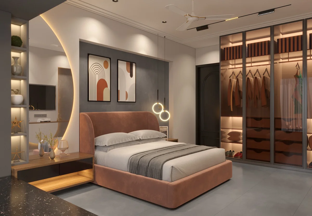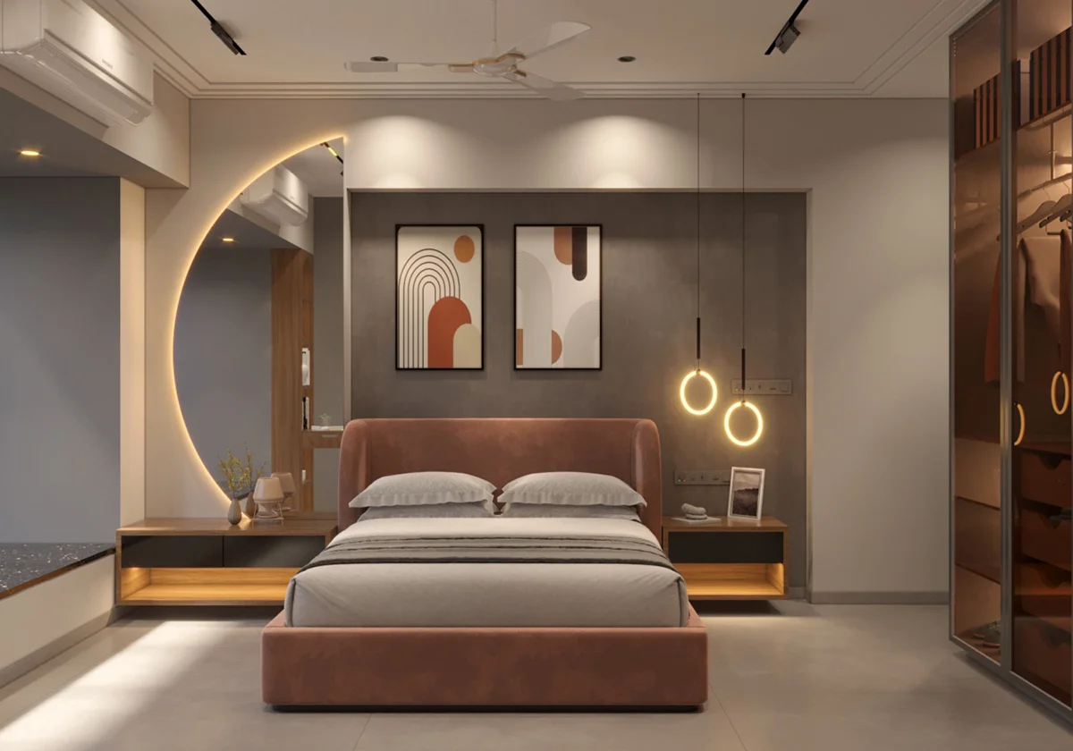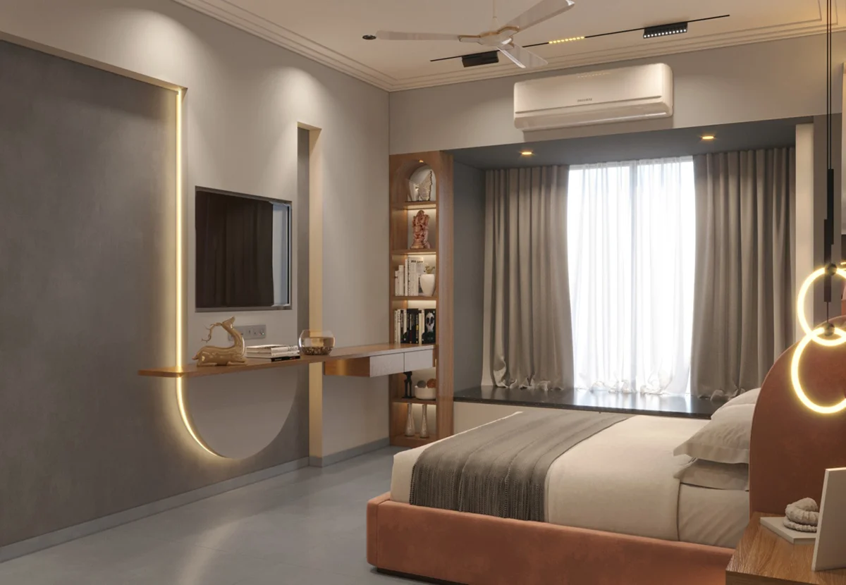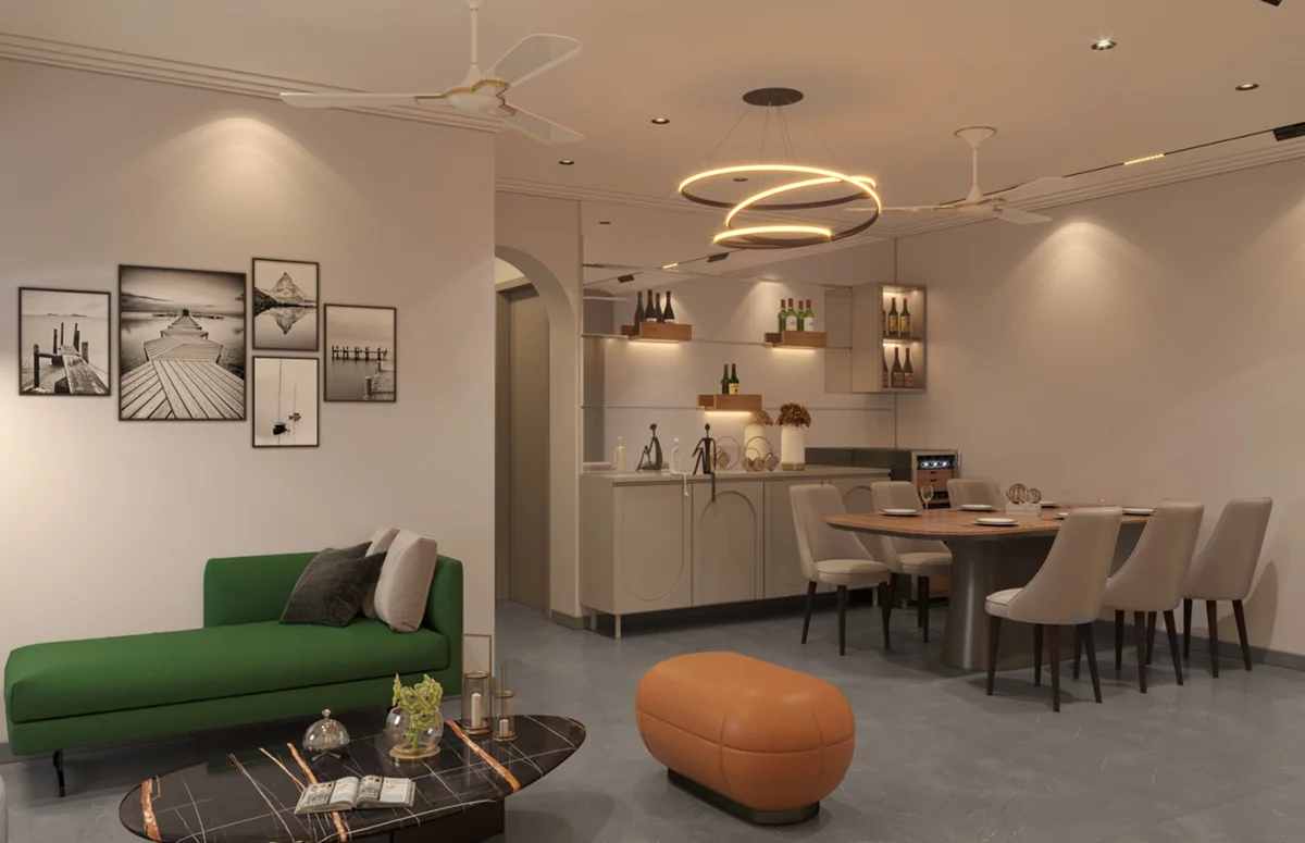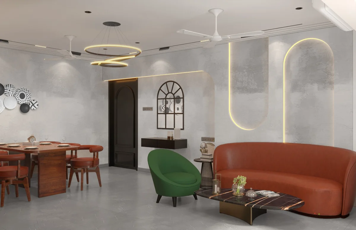 This contemporary 2 BHK project redefines modern living. The design features a thoughtful use of vibrant color accents, unique ambient lighting (like neon arches and circular pendants), and clean-lined furniture. This approach creates an artful, yet comfortable, residential space with exceptional style and high functionality.