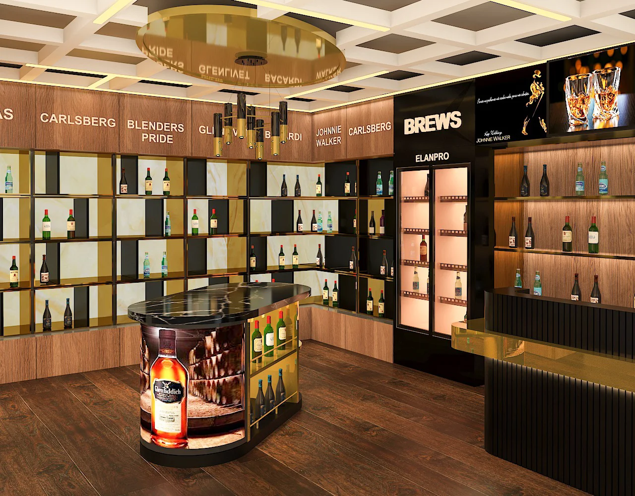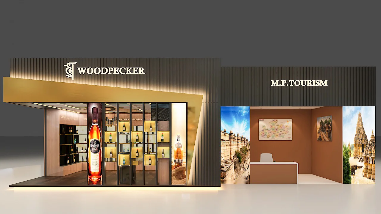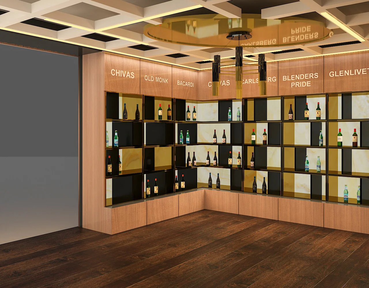 A modern wine and liquor store at the Bhopal Airport that will be completed soon. Our team blended an industrial aesthetic with premium displays, featuring interactive digital screens, bespoke lighting fixtures, and custom product shelving. This project creates a unique and immersive shopping experience, establishing it as a premier destination.