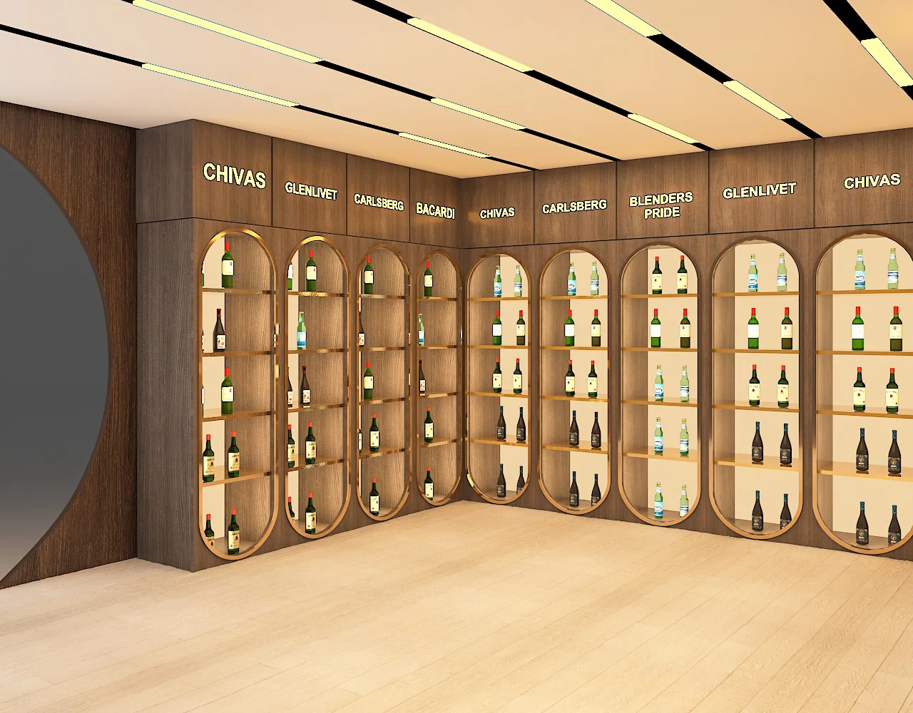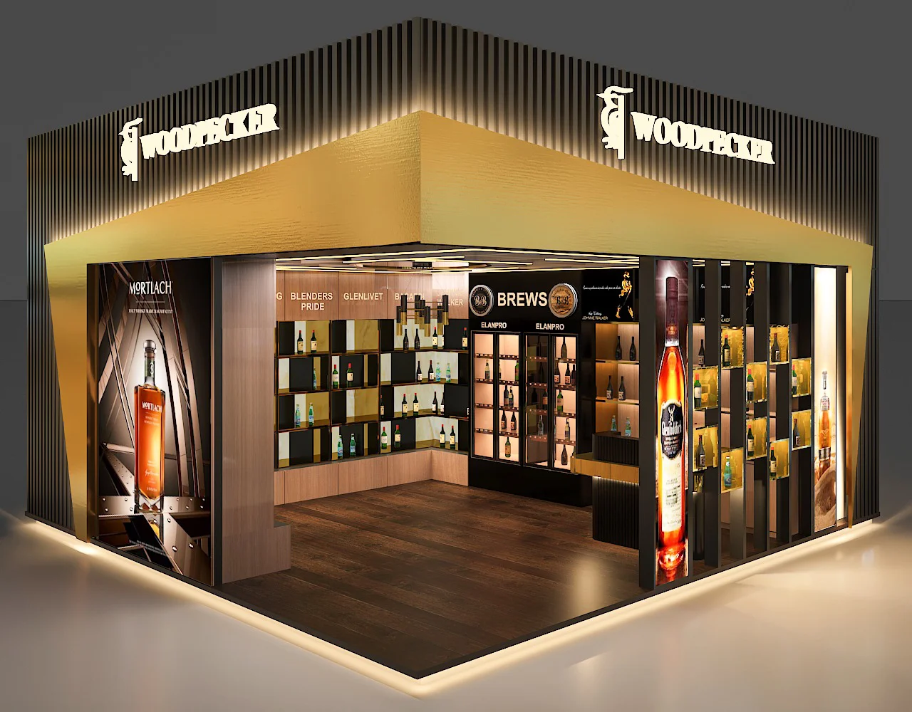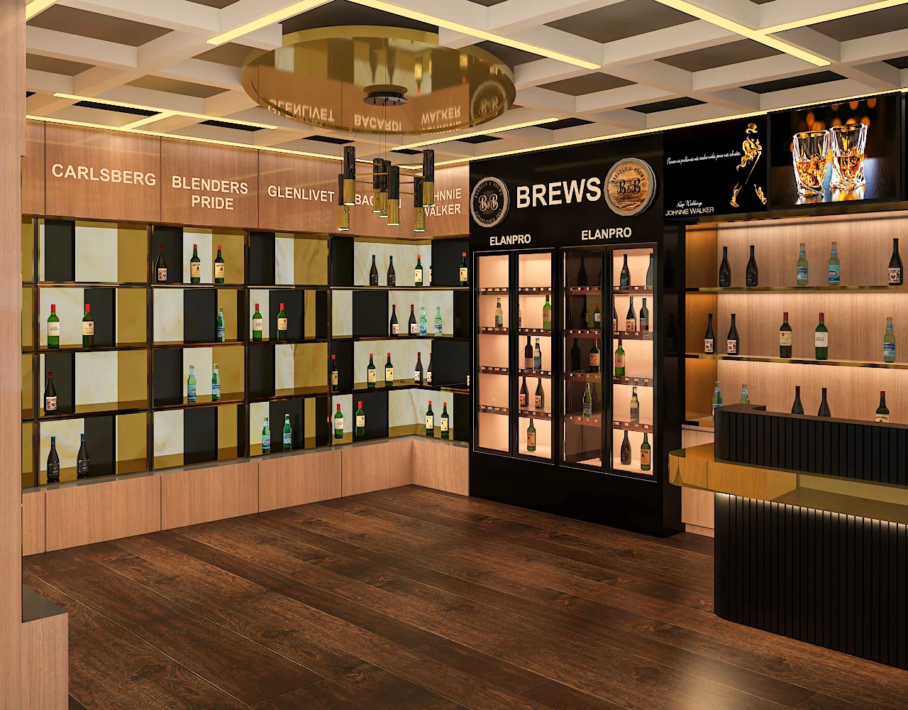A modern wine and liquor store at the Bhopal Airport that will be completed soon. Our team blended an industrial aesthetic with premium displays, featuring interactive digital screens, bespoke lighting fixtures, and custom product shelving. This project creates a unique and immersive shopping experience, establishing it as a premier destination.