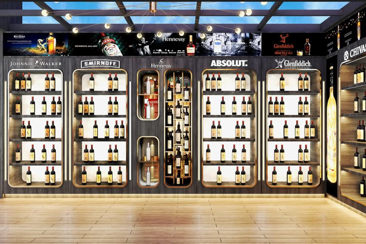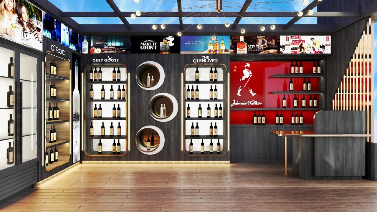 A modern wine and liquor store in Mumbai that will be completed soon. Our team blended an industrial aesthetic with premium displays, featuring interactive digital screens, bespoke lighting fixtures, and custom product shelving. This project creates a unique and immersive shopping experience, establishing it as a premier destination.