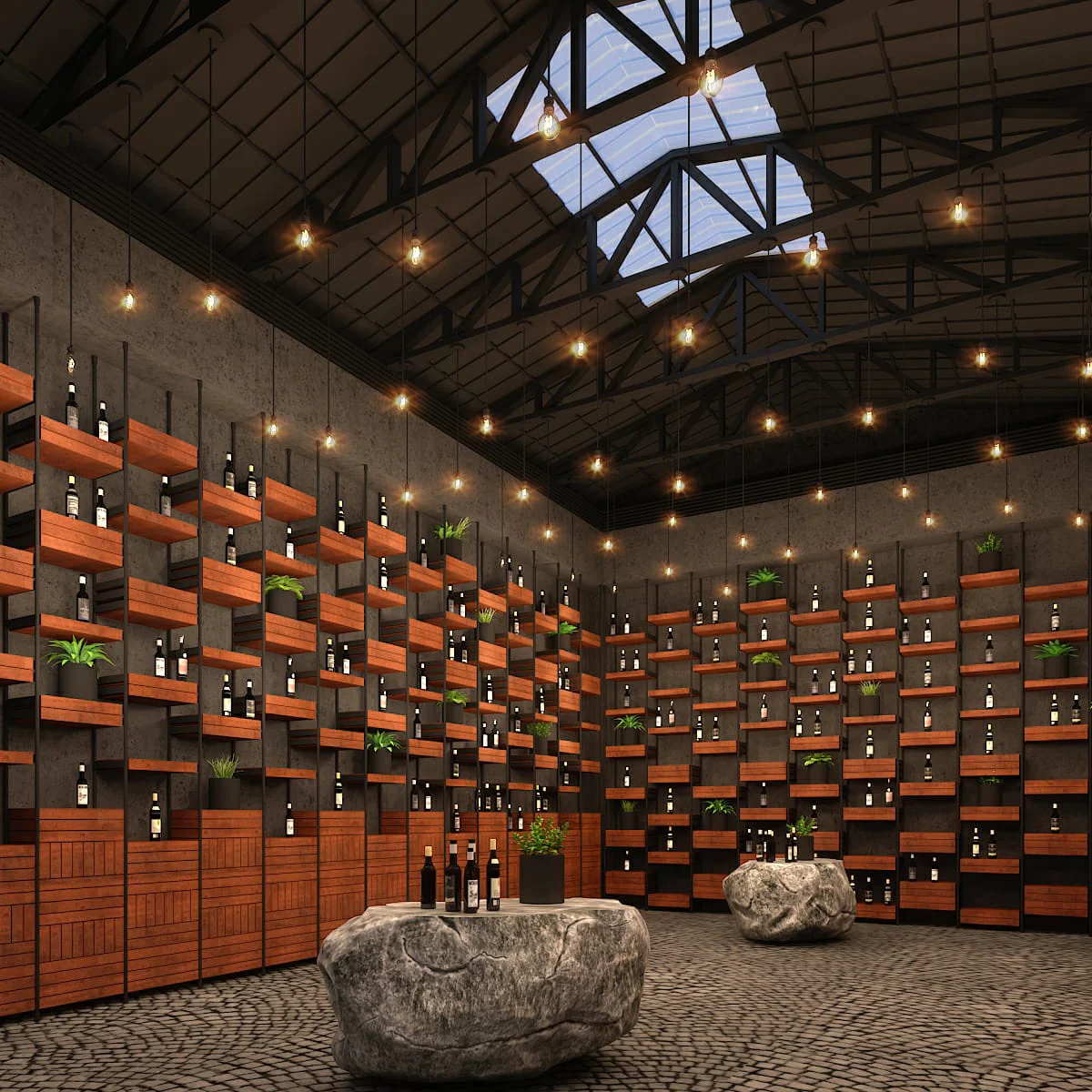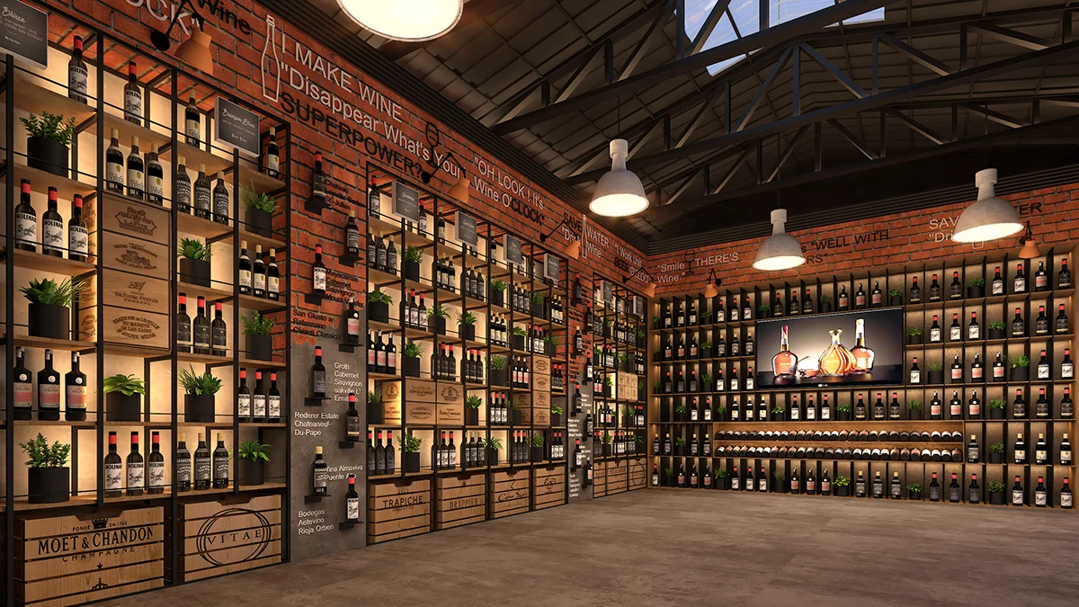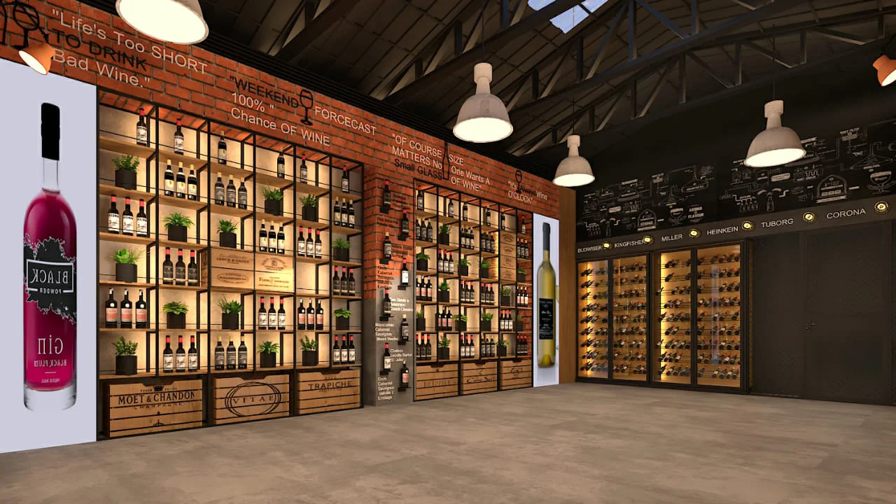 A modern wine and liquor store in Mumbai that will be completed soon. Our team blended an industrial aesthetic with premium displays, featuring interactive digital screens, bespoke lighting fixtures, and custom product shelving. This project creates a unique and immersive shopping experience, establishing it as a premier destination.