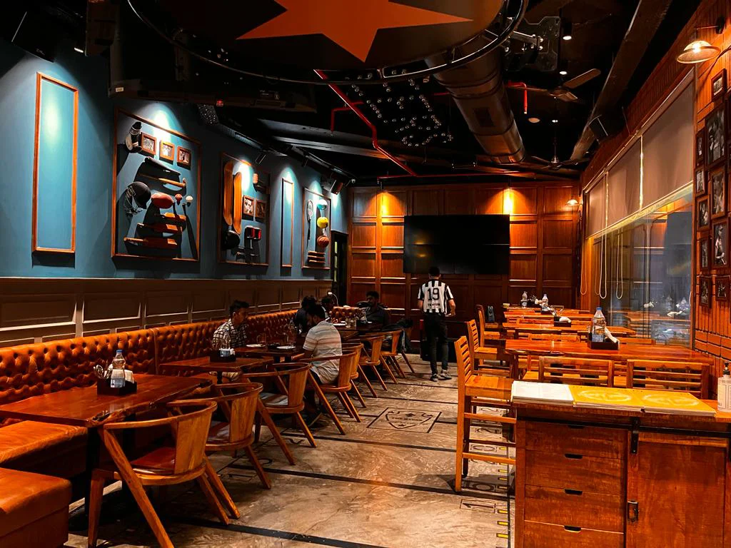 The main dining area of The Studs sports bar in Vashi, showcasing the unique star-shaped light fixture and custom sports-themed wall art.